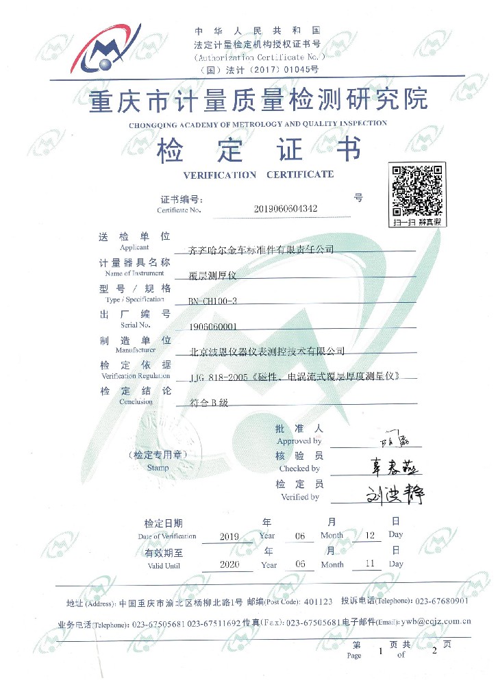 波恩儀器涂層測厚儀檢定證書
